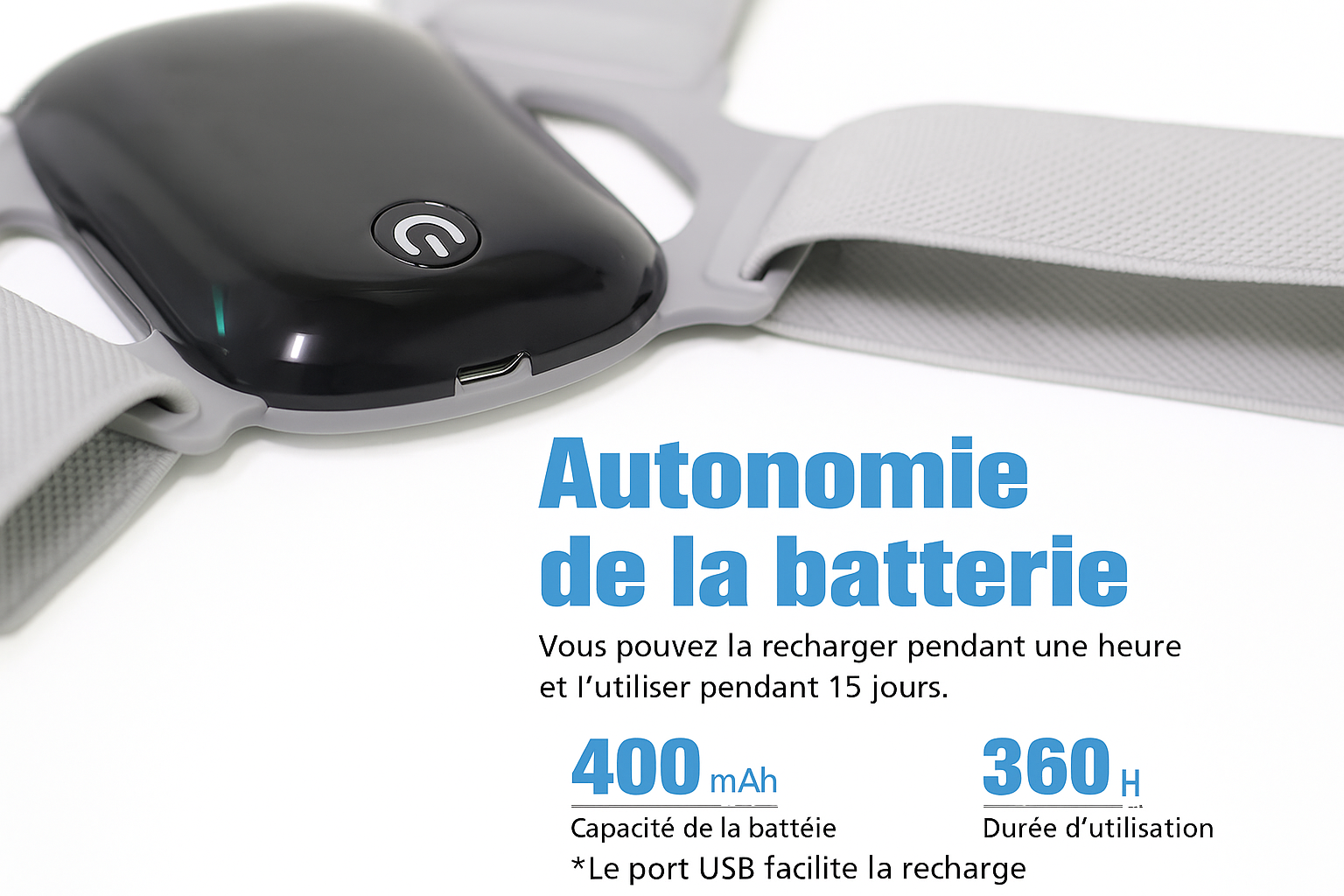 Sa batterie rechargeable par USB assure jusqu’à 10 jours d’autonomie. Résistant et fiable, Belanivo Posture+ est conçu pour un usage quotidien à long terme.