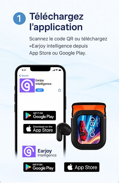 Scannez simplement le code QR présent sur le guide d’utilisation ou télécharger l’application « earjoy intelligence» sur votre téléphone (disponible sur App Store et Google Play). C’est la clé pour débloquer toutes les fonctionnalités intelligentes de votre appareil, dont la traduction IA instantanée.