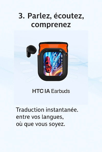Découvrez une nouvelle façon de communiquer avec HTC IA Earbuds, les écouteurs intelligents conçus pour effacer les barrières linguistiques. Grâce à leur technologie de traduction audio bidirectionnelle instantanée, vous pouvez parler et comprendre votre interlocuteur en temps réel, où que vous soyez dans le monde.